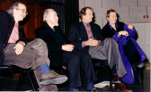 'Pressekonferenz' in der Cité de la Musique in Paris 1991. Von links: Julio Estrada, Conlon Nancarrow, Jürgen Hocker, Brunhild Ferrari. Foto: Beatrix Hocker.